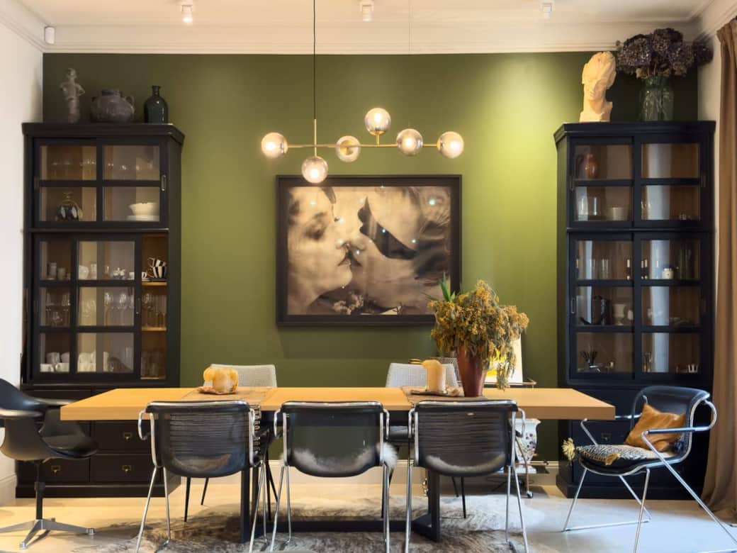 Un lumineux salon avec une grande table en bois et 3 grandes fenêtres triple vitrage. Très belle hauteur sous le plafond.